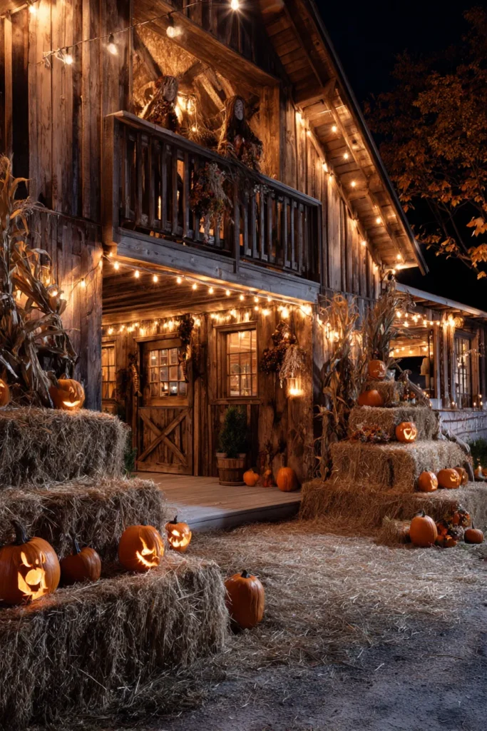 This rustic barn-style home glows under strands of warm string lights, with bales of hay stacked high and topped with grinning jack-o’-lanterns. Cornstalks frame the entrance while carved pumpkins scatter across the ground, creating a cozy harvest-meets-Halloween vibe. Even the balcony is decorated with eerie figures watching over the scene.