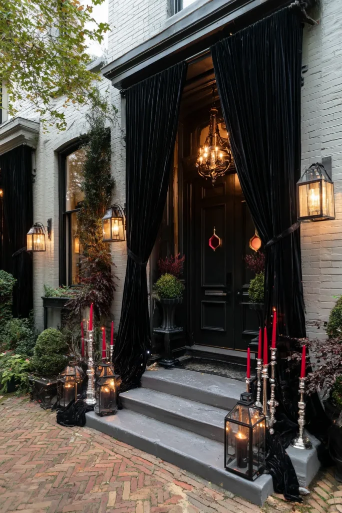 This front entry is pure drama, with floor-to-ceiling black velvet curtains framing the doorway. Tall silver candlesticks hold blood-red candles, and glowing lanterns line the steps, all leading up to a striking black door. A crystal chandelier sparkles above, casting just enough light to heighten the gothic mood.