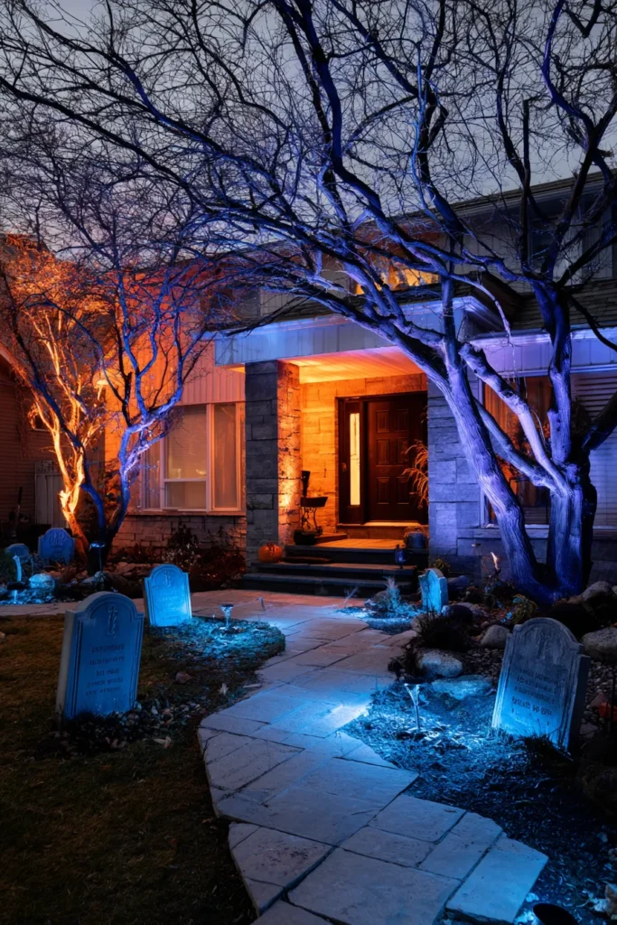 This yard transforms into a spooky cemetery with glowing gravestones, twisted trees lit in blue and orange, and a path that leads right to the front door. The dramatic lighting makes everything pop against the night sky, giving the house a chilling but magical presence.