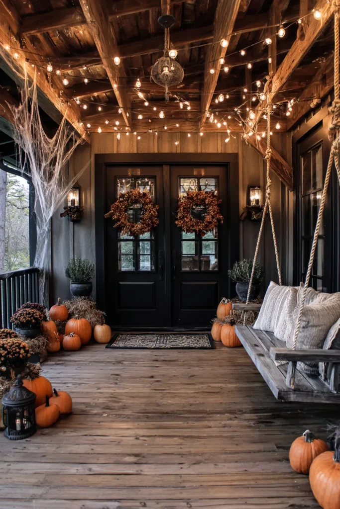 This wooden porch has a warm, rustic charm with its hanging swing, twinkling lights, and clusters of pumpkins lining the steps. Autumn wreaths on the double doors and cobwebs draped in the corner add just the right seasonal touch without overwhelming the space.