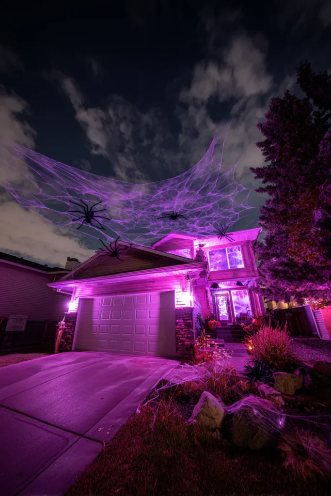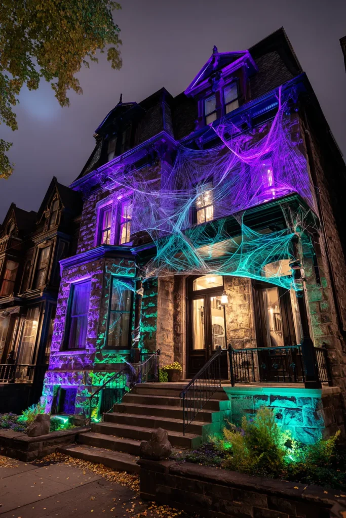 I think this look is so striking because it turns the entire house into part of the Halloween display. The colored lights add instant drama, and those massive webs make it feel like you’ve walked into a supernatural movie scene.