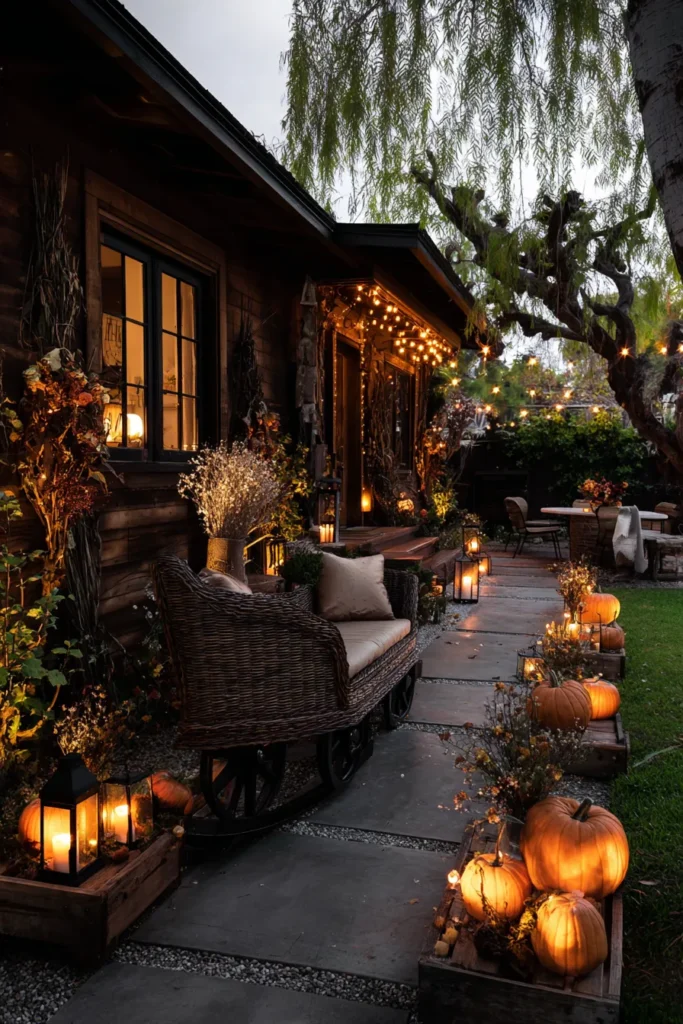 This cozy home has a welcoming walkway lined with glowing lanterns, scattered pumpkins, and autumn flowers. A wicker bench sits by the side, framed with twinkling lights above and plenty of seasonal greenery. The warm golden glow spilling out of the windows makes the whole yard feel like a fall-inspired retreat.