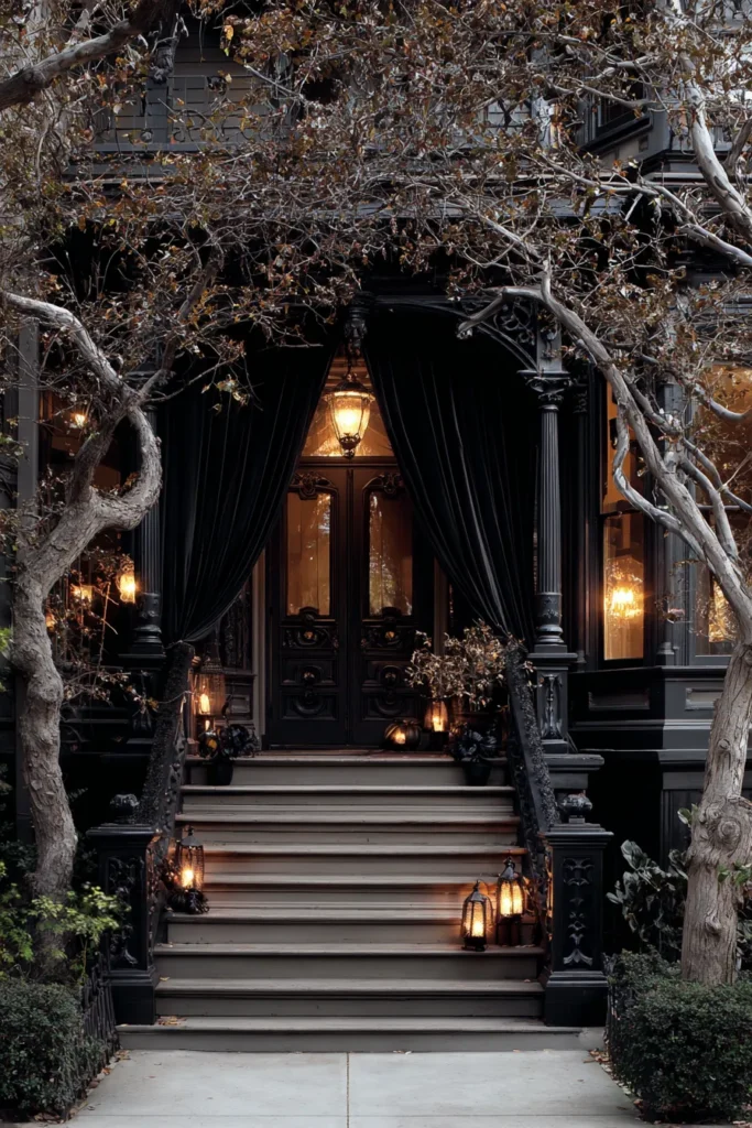 This dramatic entryway is draped in heavy black curtains, with lanterns casting a soft amber glow along the steps. The carved details of the dark Victorian façade make the setting feel both elegant and eerie. Bare tree branches frame the porch, adding a haunting silhouette against the glowing light inside.