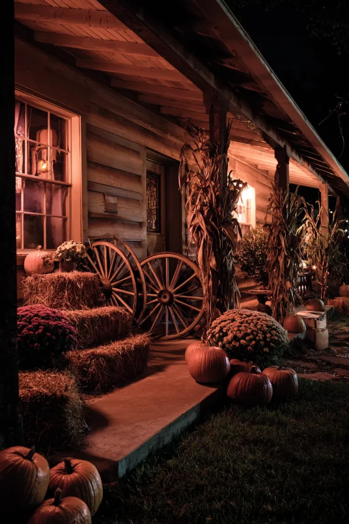 This charming farmhouse porch embraces autumn with stacks of hay bales, wagon wheels, cornstalks, and plenty of pumpkins. Warm lantern light spills across the scene, highlighting potted mums in full bloom. The rustic wood siding and simple decorations make the space feel straight out of a country harvest festival.