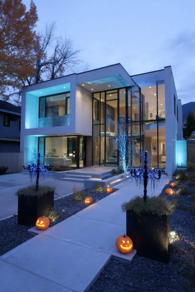 This sleek modern home uses bold lighting to create a Halloween statement, with blue spotlights highlighting its clean lines. A row of jack-o’-lanterns guides the walkway, while black candelabras wrapped in twinkle lights add a gothic twist to the minimalist landscaping. The glass walls give a peek inside, but the outside glow steals the show.