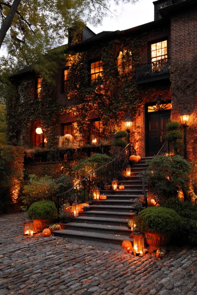 This ivy-covered brick home creates a dramatic entrance with lanterns and pumpkins lining the stone steps. Warm amber lighting spills across the exterior, making the vines glow like fire against the dark façade. The cobblestone walkway adds old-world charm that pairs beautifully with the flickering Halloween details.