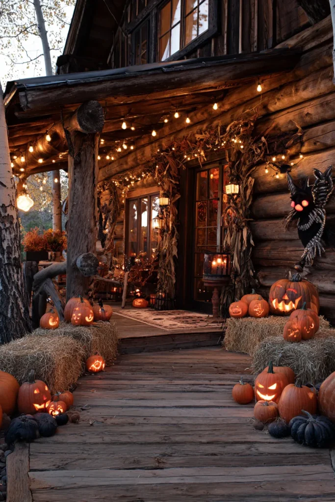 This rustic log cabin porch is bursting with personality thanks to hay bales, carved pumpkins, and festive string lights. Cornstalks frame the entry while a quirky Halloween creature with glowing red eyes adds a playful touch. The warm glow from inside the cabin completes the cozy yet spooky vibe.