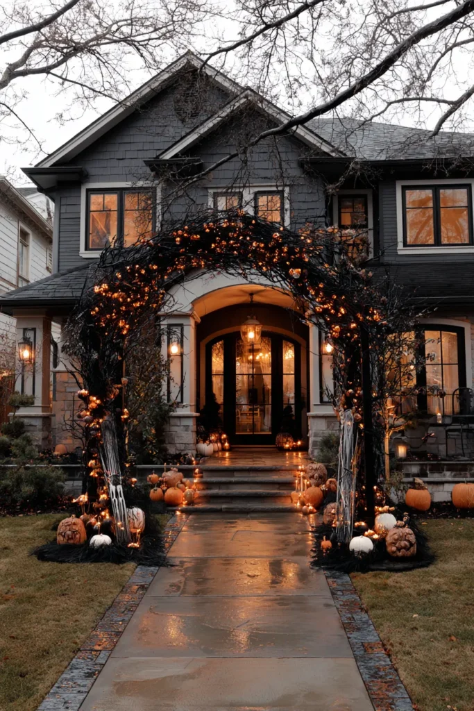 I think this is such a brilliant way to frame an entrance. The archway feels like stepping into another world, and the combination of lights and pumpkins is pure magic. It’s elegant yet playful, and it sets the perfect tone before you even reach the door.
