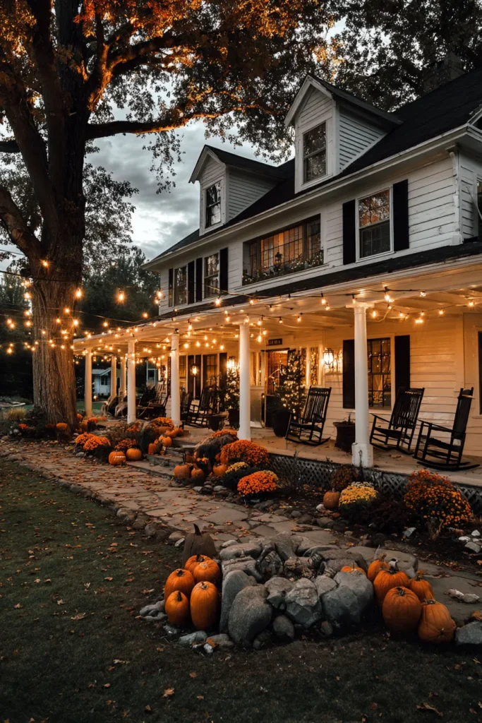 This welcoming farmhouse porch is draped in glowing string lights that stretch across the yard. Pumpkins and colorful mums line the stone pathway, while rocking chairs wait on the wide porch for cozy fall evenings. The white siding and black shutters make the orange tones pop beautifully.