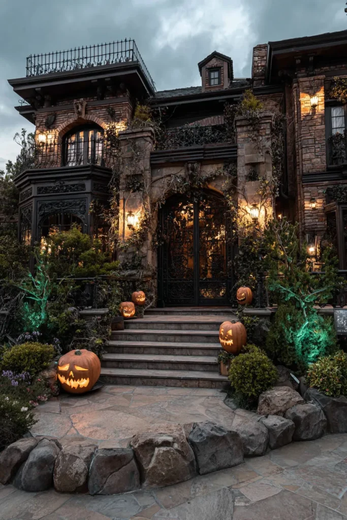 This imposing stone mansion makes a bold Halloween statement with jack-o’-lanterns placed along the stairs and glowing lights tucked into the ivy-covered walls. The wrought iron gates and balcony railings add a moody gothic touch that pairs perfectly with the dramatic lighting. Every detail works together to create the feel of a haunted manor straight out of a classic tale.