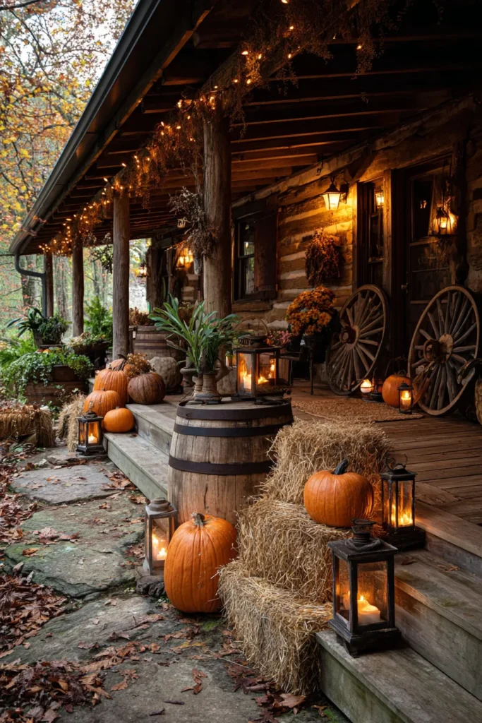 This log cabin porch is decorated with hay bales, wagon wheels, and glowing lanterns nestled between pumpkins. The string lights overhead add a soft sparkle, while barrels and planters give the setup a lived-in, rustic feel. The warm glow spilling from the cabin windows makes the entire scene welcoming.