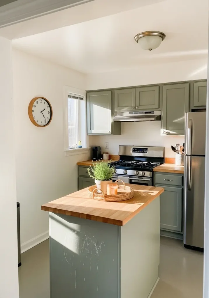 This kitchen layout features a smart use of earthy tones and natural textures to create a cozy culinary nook. The sage green cabinetry offers a muted pop of color that pairs beautifully with the warm butcher block countertops and the small central island. Stainless steel appliances provide a sleek contrast to the soft matte finish of the cupboards, while a minimalist wooden wall clock and a simple wicker tray add a touch of rustic charm. Natural light pours in from the side window, which highlights the smooth transition between the creamy white walls and the organic green accents.