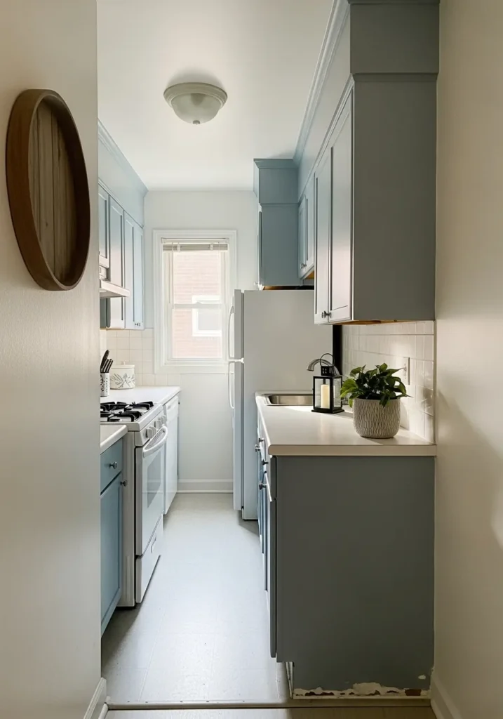This compact galley kitchen uses a soft, powdery blue on the cabinetry to create an incredibly light and open atmosphere. The pastel cabinets extend to the ceiling, maximizing storage while keeping the narrow space from feeling heavy. White square tiles form a clean backsplash that ties in with the bright white appliances and countertops. A single window at the far end acts as a natural light source, reflecting off the pale gray floors. Small decorative touches like a wooden wall bowl and a lush green plant in a textured gray pot add a hint of organic warmth to the cool-toned environment.