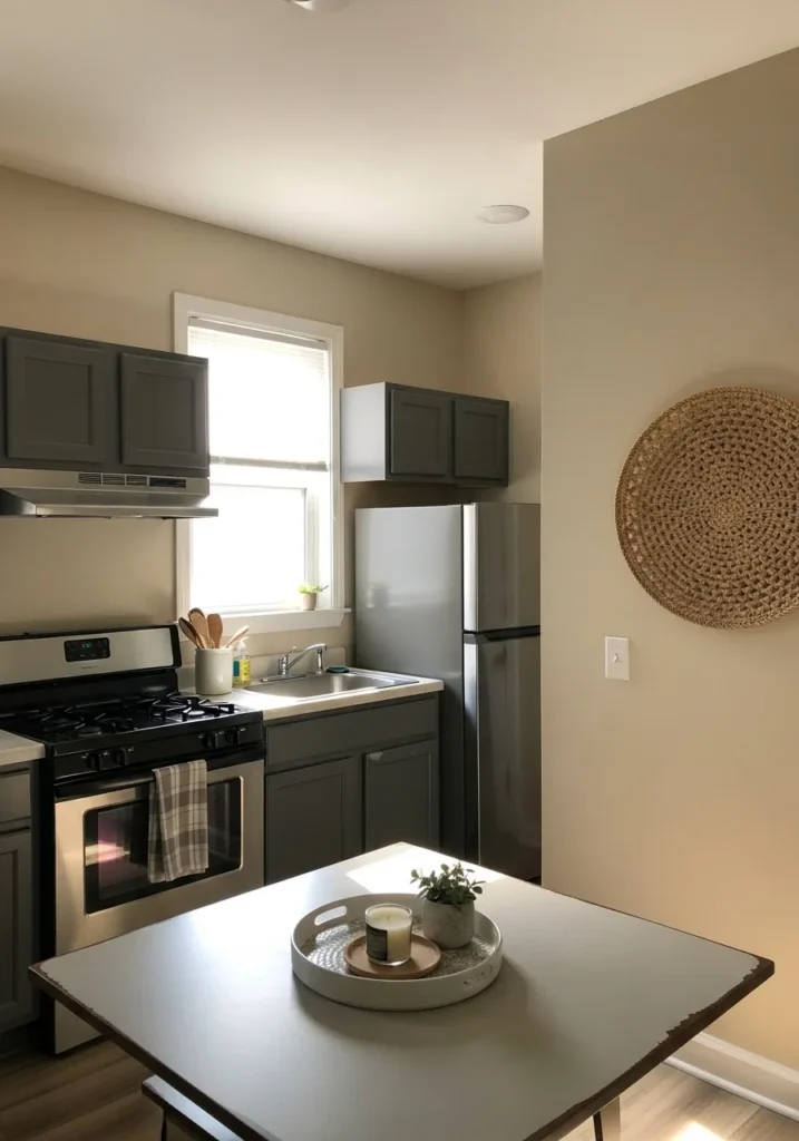This kitchen transitions beautifully into a modern-meets-traditional aesthetic by pairing deep charcoal cabinetry with soft sand-colored walls. The layout is clean and efficient, featuring stainless steel appliances that catch the light from the side window. A central table with a light grey top serves as a functional prep station, decorated with a simple white tray, a candle, and a small potted succulent. On the far wall, a large circular woven basket adds a splash of bohemian texture that breaks up the flat surfaces of the walls and cabinets perfectly.