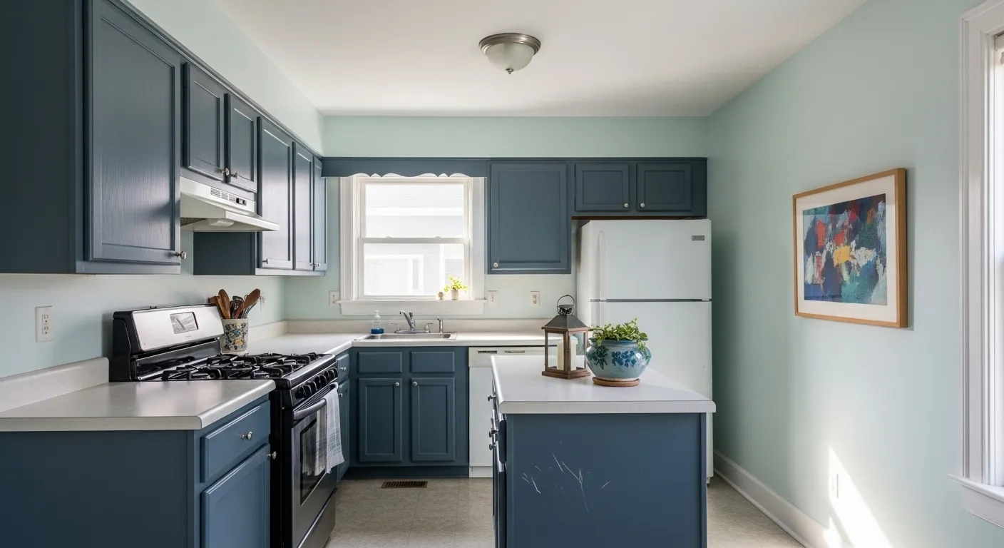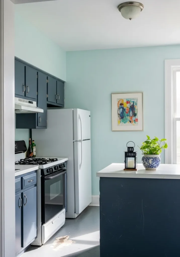 This kitchen features a beautiful, cool-toned palette that instantly opens up the room. The walls are coated in a refreshing pale aqua that makes the white trim and refrigerator pop, while the cabinetry is finished in a sophisticated, deep slate blue. A clean white countertop serves as the perfect workspace, accented by a charming blue and white patterned planter and a simple black lantern. The layout is efficient and bright, with a window nearby that allows natural light to dance off the smooth surfaces and highlight the colorful abstract art piece on the wall.