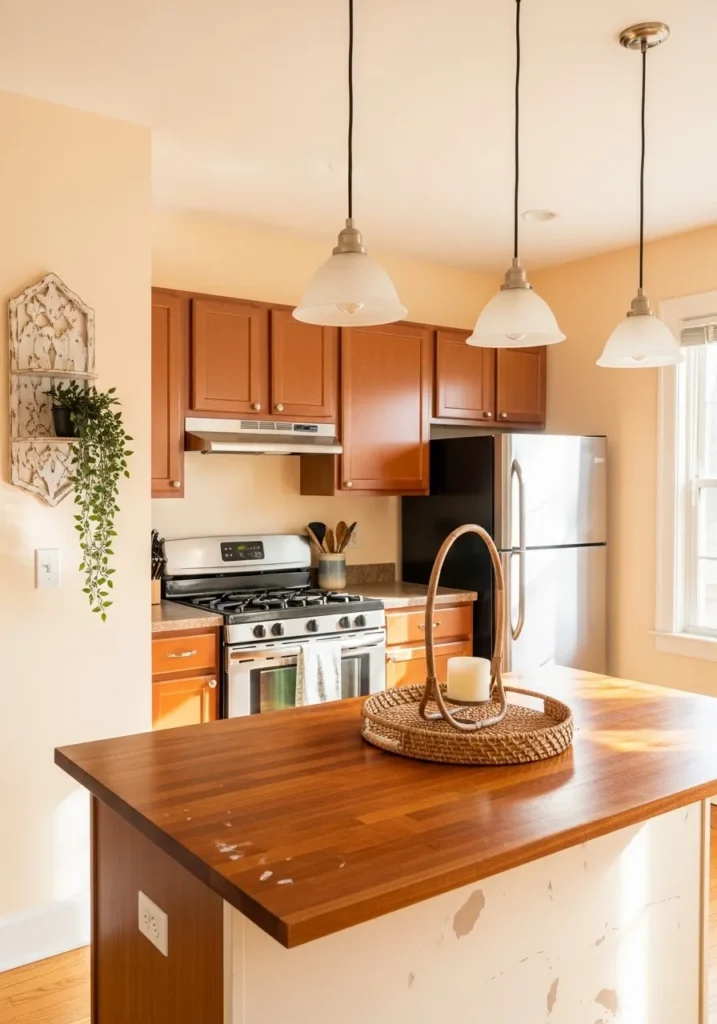 I love how this specific shade manages to look like a permanent golden hour. It makes the wood cabinets look rich rather than dated, which is a total win in my book. There is something so comforting about this setup that makes me want to bake a batch of cookies and just hang out by the island. The way the light bounces off the surfaces creates such a cheerful vibe that would make even a rainy Monday morning feel a little brighter.