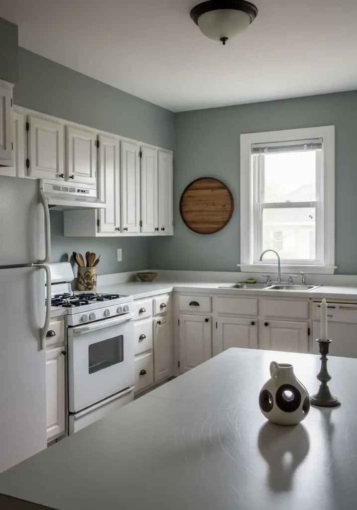 This kitchen setup feels like a breath of fresh air with its muted sage and blue undertones that instantly cool down the room. The soft white cabinetry provides a crisp contrast against the seafoam walls, while the dark hardware adds just enough definition to keep things from looking washed out. An L-shaped counter layout maximizes the workspace, and the addition of a wooden circular wall hanging brings in a touch of organic warmth to balance the cool palette. Bright light floods in from the window, making the white appliances and countertops gleam with a clean, polished finish.