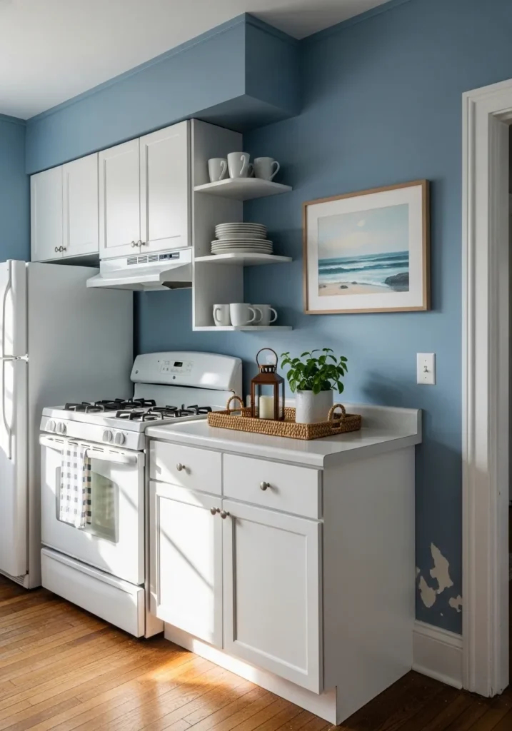 This kitchen layout makes a bold yet peaceful statement with its deep denim blue walls that provide a stunning backdrop for the bright white cabinetry. The design utilizes vertical space perfectly with open shelving that displays clean white dishware, while a framed coastal art piece ties the oceanic color palette together beautifully. Warmth is introduced through the original hardwood flooring and a woven tray on the counter, creating a balanced look that feels both curated and comfortable. Natural sunlight hits the white surfaces, making the small corner feel airy and expansive despite the richer wall color.