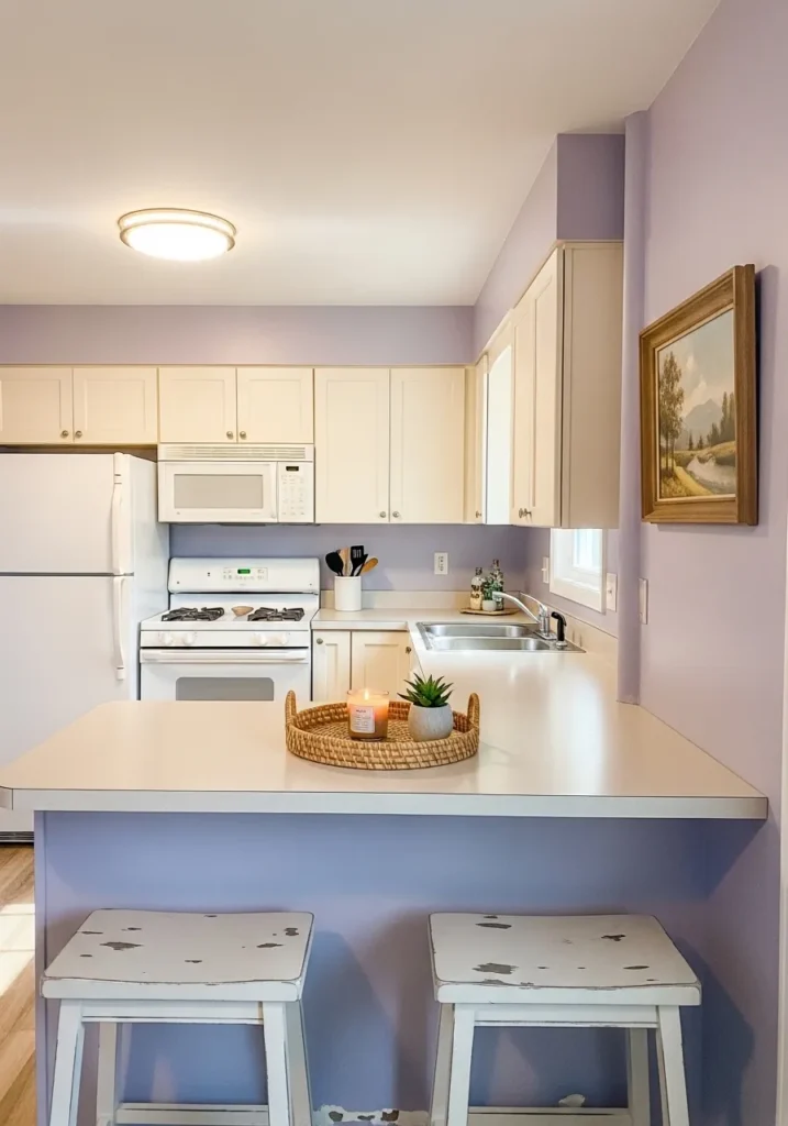 This kitchen layout creates a dreamy and imaginative vibe by using a soft lavender on the walls to contrast against cream-colored cabinetry. The design makes the most of a compact corner with a peninsula breakfast bar that provides plenty of surface area for morning prep or casual dining. Distressed white bar stools add a touch of farmhouse charm, while the gold-toned light fixture and framed landscape art bring in a sense of classic warmth. White appliances and light countertops keep the overall look feeling bright and unobstructed, allowing the unique purple hue to really take center stage without feeling heavy.
