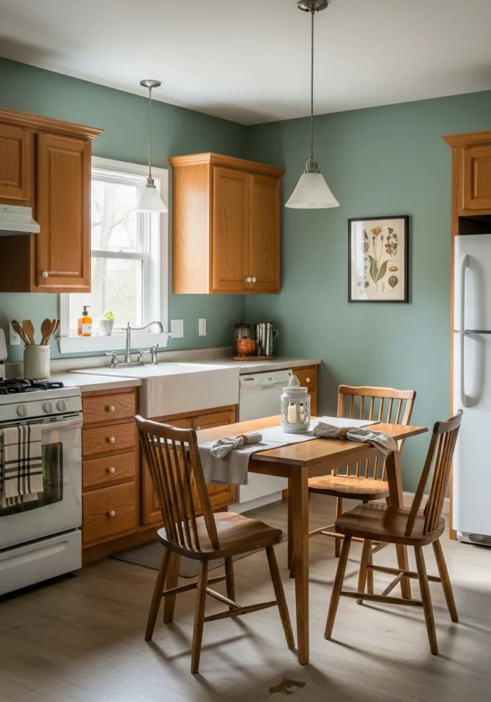 I find the combination of that specific green-blue hue and the natural wood grain to be such a clever way to modernize traditional oak cabinets. It feels like a cozy hug in room form, especially with the way the sunlight dances off the table. This setup proves that you don’t need a massive footprint to have a kitchen with a huge personality. Seeing that little lantern on the table just makes me want to pull up a chair and stay for hours with a good book.