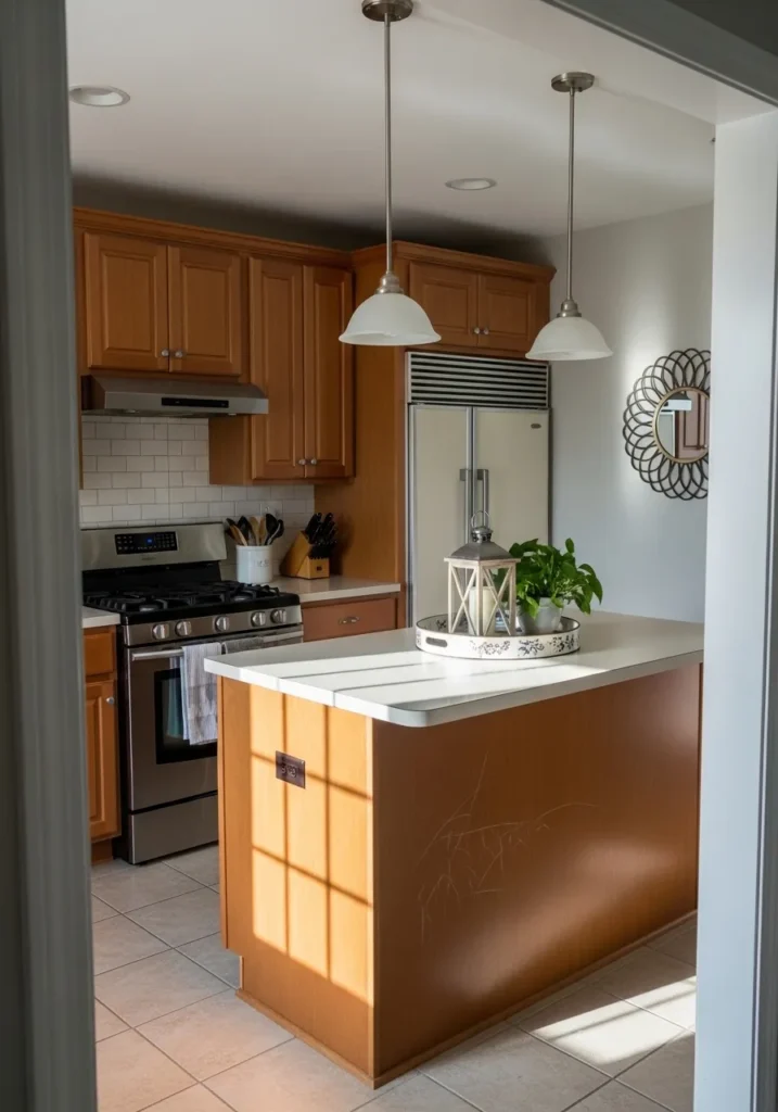 This open kitchen design balances rich wood tones with soft, sandy neutrals to create a space that feels anchored and airy all at once. The dark cherry wood cabinetry offers a classic, upscale look that is beautifully brightened by the creamy beige walls and light beige floor tiles. A central island with a white countertop provides plenty of workspace, accented by a woven tray with a candle and a tiny succulent for a touch of life. Two elegant pendant lights with frosted glass shades hang above the island, while a decorative scrolled metal wall art piece adds a bit of vintage personality to the dining area in the background.