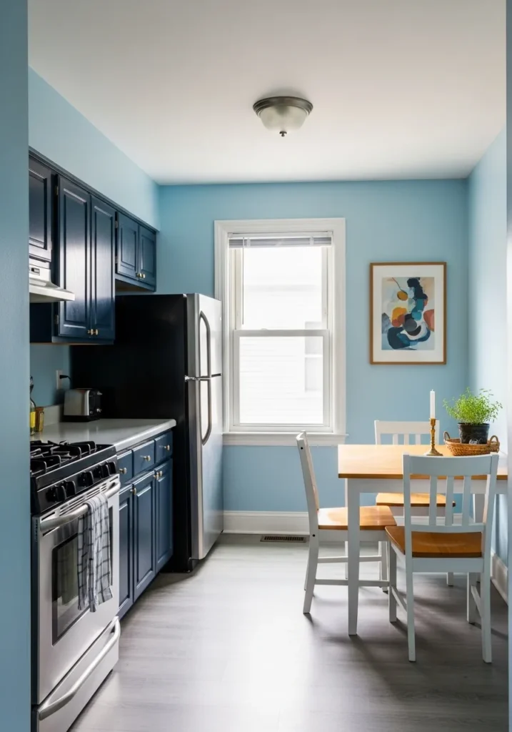 This kitchen layout maximizes a narrow space by pairing soft sky blue walls with deep navy cabinetry for a high contrast and energetic look. The design features a cozy dining nook with a white and wood table set that sits perfectly under a bright window, allowing natural light to dance across the light gray flooring. A modern abstract art piece hangs on the wall, pulling together the various shades of blue and providing a focal point that feels curated. Stainless steel appliances and crisp white trim keep the room feeling contemporary and clean, ensuring the bold cabinet color doesn’t overwhelm the small footprint.