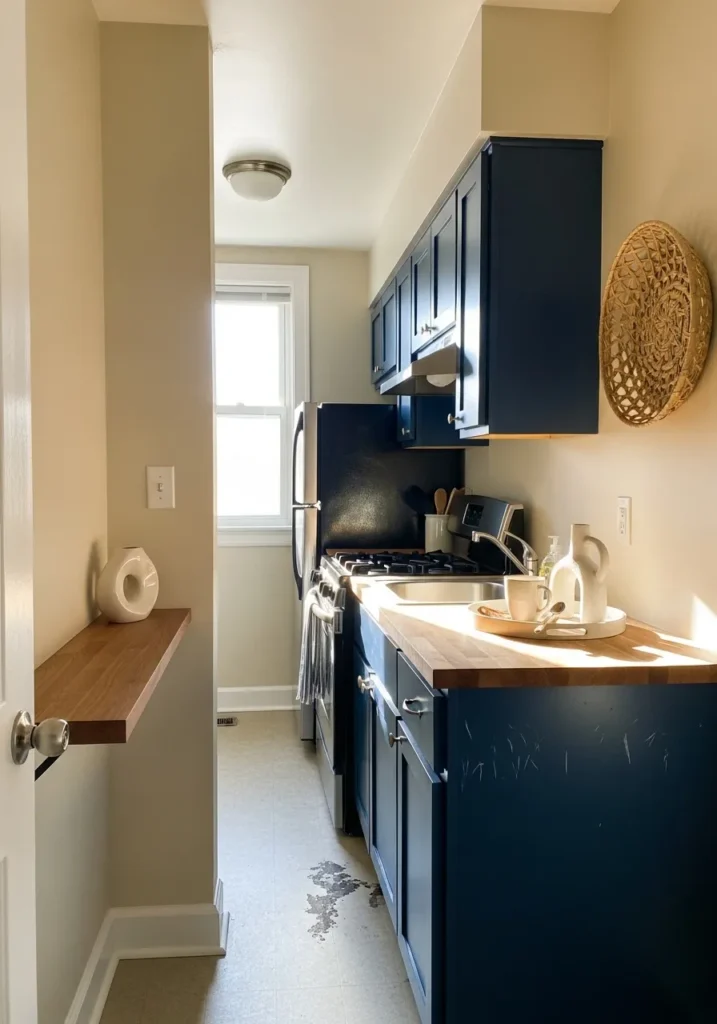 This narrow galley kitchen makes a huge impact by using a deep navy blue on the cabinetry to ground the entire space. The rich tone of the cupboards creates a stunning contrast against the light beige walls and the warm wood of the butcher block countertops. A floating wooden shelf on the opposite wall mimics the counter material, providing a clever spot for minimalist decor like a circular white vase. The layout is topped off with functional touches like a woven wall basket and a bright window at the end of the hall that ensures the moody blue doesn’t feel too heavy in the compact footprint.