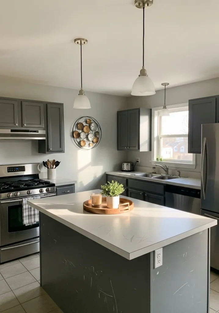 This spacious kitchen design showcases how a moody charcoal gray can actually make a room feel expansive when paired with the right lighting. The deep slate-colored cabinets provide a sharp contemporary look against the pale, cool-toned walls and light gray floor tiles. A generous central island with a crisp white countertop serves as the heart of the room, decorated with a simple wooden tray and a burst of greenery. Three frosted glass pendant lights hang above the workspace, while a unique circular metal wall sculpture adds a dash of artistic texture to the clean lines of the stainless steel appliances.