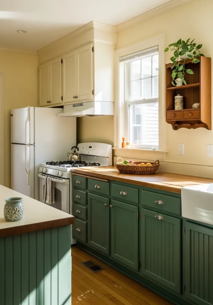 This kitchen design artfully blends deep, saturated tones with classic farmhouse elements to create a space that feels both historic and fresh. The lower cabinets are finished in a rich, forest green that grounds the room, while the upper cabinets sport a light cream to keep the ceiling feeling tall and airy. Warm butcher block countertops run the length of the prep area, punctuated by a large white apron-front sink and a vintage-style white stove. A charming wooden wall cubby holds a trailing ivy plant, adding a touch of vertical greenery that mimics the natural light streaming in through the classic sash window.