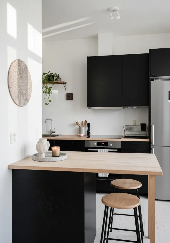 This kitchen design is a masterclass in high-contrast minimalism, featuring flat-panel black cabinetry that looks incredibly sharp against the bright white walls. The layout uses a peninsula with a light wood butcher block top that doubles as a casual dining spot, complete with two matching wooden stools. Stainless steel appliances and a sleek induction cooktop keep the vibe modern, while a trailing ivy plant on a floating shelf and a woven wall hanging bring in just enough organic texture to soften the bold color palette.