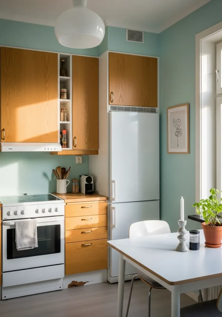 Cool mint and warm pine? Such a good combo. If you are into a look that feels both retro and modern, this combination is a total winner for making a small kitchen feel much larger. There is something so cheerful about seeing a bright blue kettle on the stove against such a fresh backdrop. It really proves that you don’t need a massive space to have a kitchen that is absolutely brimming with personality and charm.