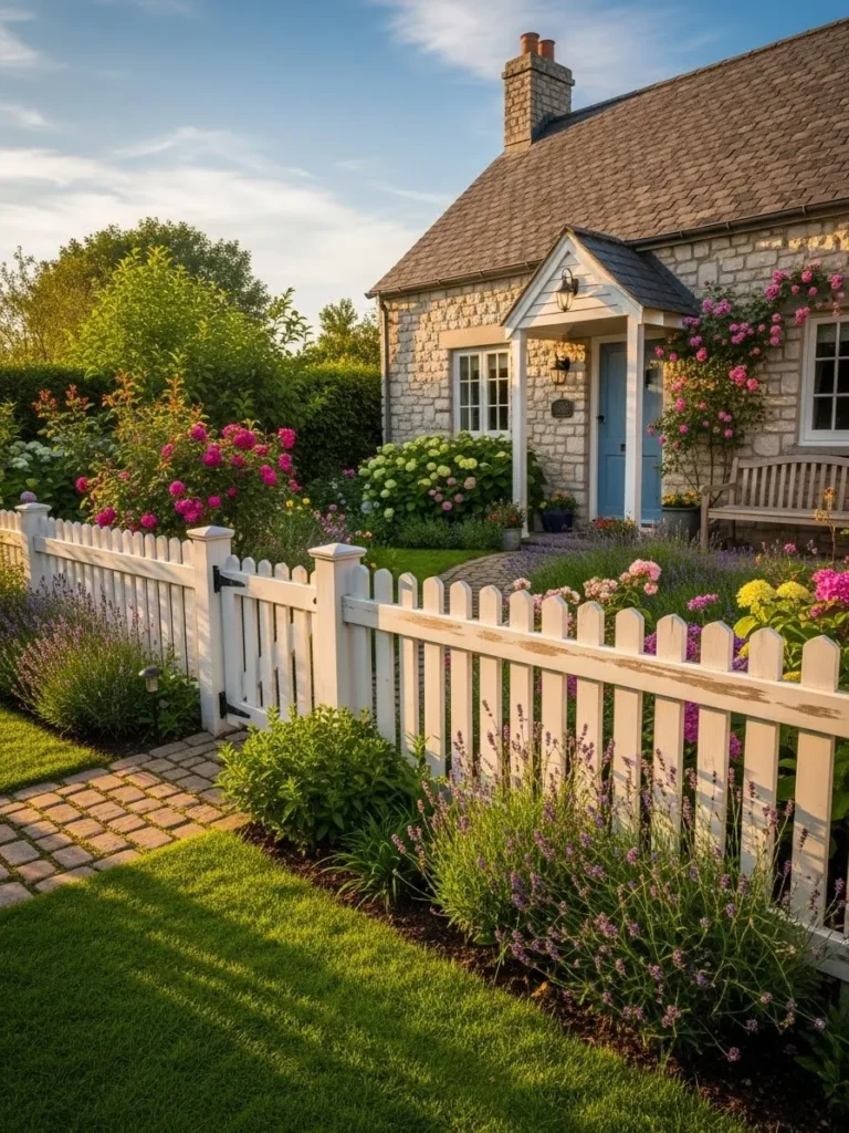 This white fence frames a garden path leading toward a cozy porch, with colorful flowers lining the way. The fence adds structure while still allowing the garden to feel full and vibrant. It feels cheerful and thoughtfully designed.