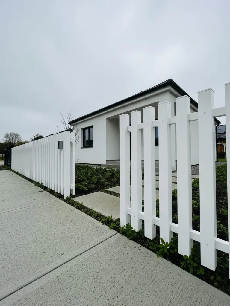 This clean white fence runs alongside a simple sidewalk, creating a neat and orderly look. The vertical slats add height and privacy while keeping the overall design light and approachable. Paired with a modern home, the fence feels fresh and understated.