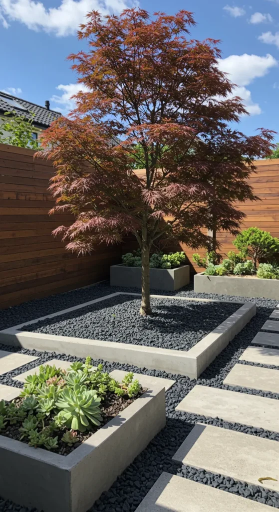 This contemporary backyard features a beautifully manicured garden surrounding a stunning Japanese maple tree. The lush green foliage of the tree contrasts wonderfully with the clean lines of the concrete planters and dark gravel pathways. Simple, geometric shapes create a balanced yet natural design, making this space perfect for quiet reflection or outdoor gatherings. The textured gravel enhances the design’s minimalistic yet stylish appeal, while the leafy greens and succulents add a vibrant splash of color that complements the overall tranquil atmosphere.