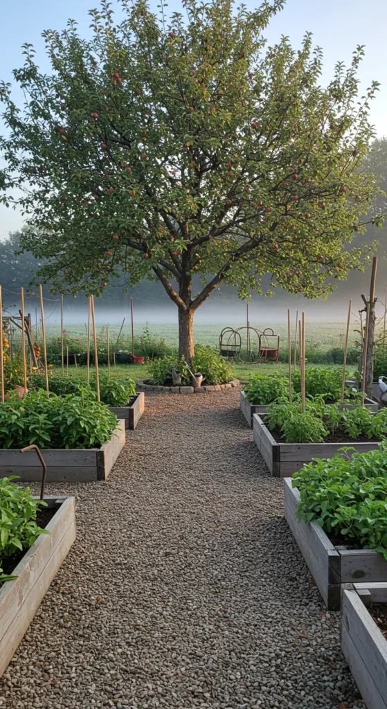 This delightful garden features a charming gravel path that winds its way beneath a fruit-laden tree, offering the perfect balance of natural beauty and functionality. The gravel path is flanked by neatly organized raised garden beds, filled with vibrant plants ready to be harvested. In the distance, a cozy bench under the shade of the tree provides the perfect spot to relax and enjoy the view. The soft morning light gently illuminates the scene, adding a peaceful, almost magical atmosphere to the garden.