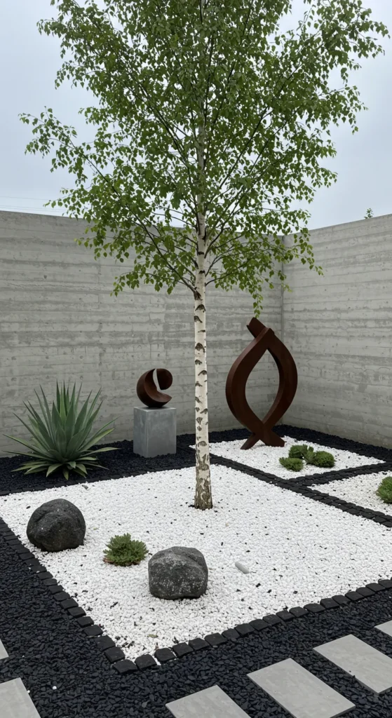What I absolutely adore about this design is how the combination of natural and sculptural elements creates a harmonious balance. The birch tree brings a soft, organic feel, while the sleek sculptures and geometric layout add an edgy, contemporary vibe. It’s such a stunning way to bring together art and nature. If you’re into minimalist designs that don’t feel too sterile, this would be the perfect inspiration for transforming your outdoor space into a modern, calming retreat.