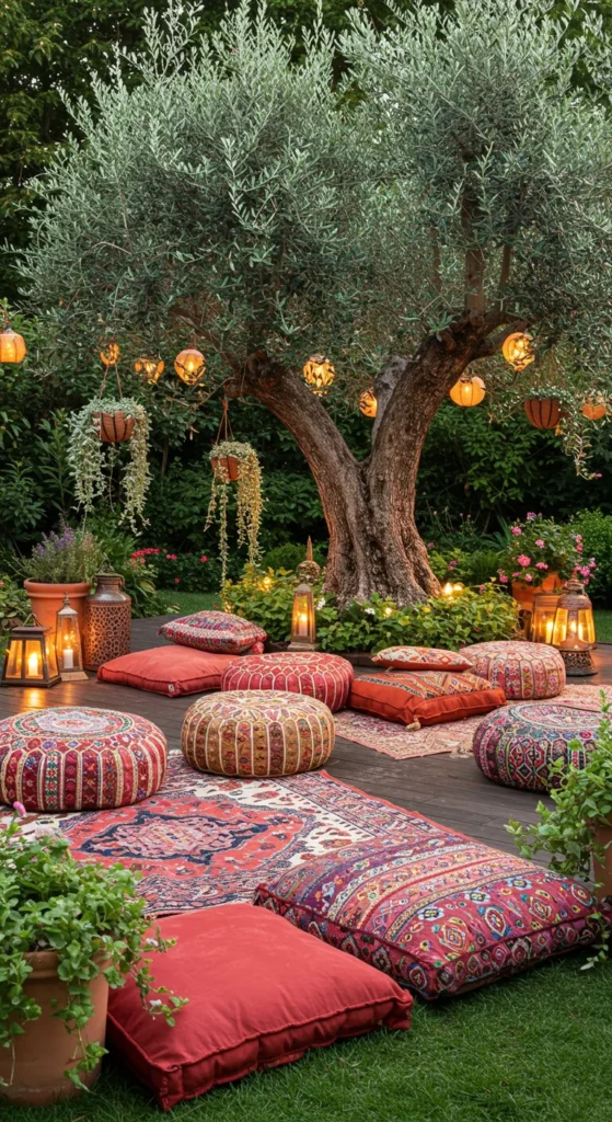 This bohemian-inspired garden seating area is centered around a gorgeous olive tree, whose wide canopy provides perfect shade for the cozy gathering space beneath. Plush, colorful pillows in vibrant patterns cover the ground, inviting you to relax and unwind. Soft lighting from hanging lanterns and candles create a warm, inviting glow as the evening falls. Lush greenery, potted plants, and beautiful flowers surround the space, adding to the overall charm and tranquility of the setup. The carefully chosen design elements, from the earthy rugs to the hanging planters, make this outdoor space feel like a magical, serene retreat.