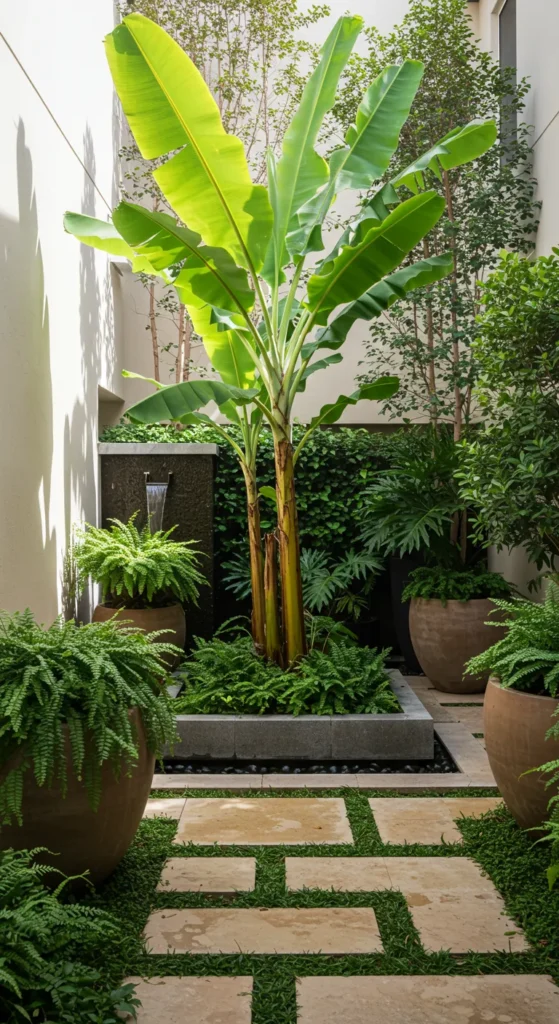 This modern courtyard design features a beautiful banana tree as the centerpiece, surrounded by lush greenery and a minimalist water feature. The tree stands tall with its vibrant, large leaves, adding an exotic touch to the space. Clean, structured lines are created with the placement of large terracotta pots and neatly arranged plants. A gentle water stream flows through the stone basin, enhancing the peaceful atmosphere. The design is anchored with smooth stone pathways, creating a perfect balance of nature and contemporary style.
