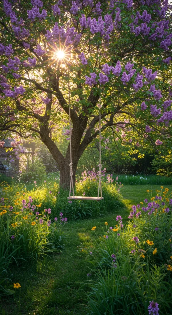 This enchanting garden features a beautiful lilac tree draped with soft purple blooms, creating a stunning focal point in the landscape. A simple wooden swing hangs from one of its branches, offering a perfect spot to relax and enjoy the tranquil setting. The area around the tree is lush with vibrant flowers in shades of purple and yellow, creating a lively and colorful garden space. The warm sunlight filters through the branches, adding a golden glow to the garden, which gives it a dreamy, almost magical atmosphere.