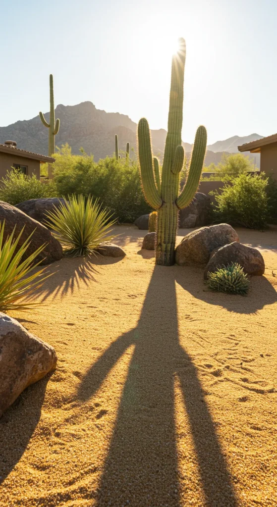 This striking desert landscape is dominated by a tall saguaro cactus, casting long shadows across the golden sand. The landscape is punctuated by lush agave plants and smooth rocks, giving the space a natural, rugged feel. The warm sun bathes the entire area, creating a serene atmosphere as the cactus stands proud in the foreground. The minimalist design keeps the focus on the beauty of the desert flora, with soft lines in the sand that mimic the natural curves of the land.