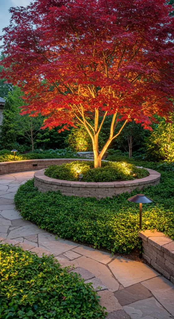 This enchanting garden features a striking red maple tree as the focal point, surrounded by a carefully curated landscape. The tree’s vibrant red leaves stand out beautifully against the greenery, creating a dramatic effect. A winding stone pathway leads you to the tree, where soft lighting illuminates the surrounding plants and tree trunk, highlighting the texture and color. The stone retaining walls surrounding the tree and plants add a touch of elegance, perfectly framing the space while providing structure to the natural elements.