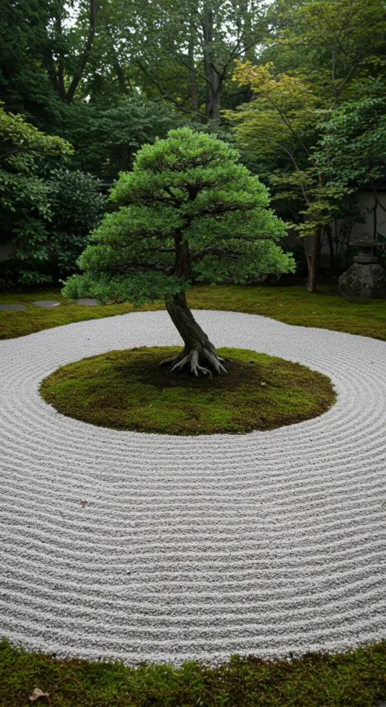 This serene garden is anchored by a stunning bonsai tree, surrounded by carefully arranged raked white gravel that creates concentric circles, offering a tranquil and meditative atmosphere. The green moss along the edges contrasts beautifully with the fine lines in the gravel, while the small, delicate tree stands as the perfect focal point. The simplicity of the design, with its smooth, clean lines and natural elements, creates a feeling of peacefulness and balance that is a hallmark of traditional Zen gardens.