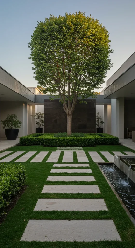 This contemporary courtyard features a neatly pruned tree at the center, perfectly framed by geometric stone pavers and lush green grass. The tree, with its symmetrical shape and clean lines, is placed in the middle of the courtyard, drawing the eye toward it. Surrounding the tree, the grass is edged by tidy shrubbery, and a minimalist water feature flows peacefully in the corner, adding an element of tranquility to the design. The use of light stone, smooth surfaces, and natural greenery creates a balanced and calm atmosphere, with the perfect blend of modern aesthetics and nature.