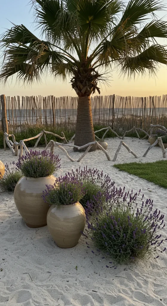 I absolutely adore the laid-back, breezy feel of this design. The palm tree is perfect for this coastal setting, and I love how the lavender plants add such a refreshing pop of color against the warm sand. The driftwood furniture really brings that beachy vibe home, making it feel like the ultimate place to relax and unwind. If you’re into creating a serene, tropical-inspired garden space, this setup is full of dreamy, vacation-worthy inspiration!