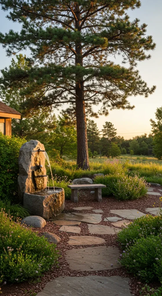 This peaceful garden space centers around a stunning water feature made from natural stone, with water gently flowing from the top of the rocks into a small basin below. The pathway is made up of irregularly shaped stone slabs, which guide the eye and feet around the space, creating a serene, meandering route through the garden. Lush greenery surrounds the feature, with bushes and plants cascading over the edges, and a stone bench tucked away for moments of relaxation. The tall pine tree offers shade and height, bringing balance to the design.