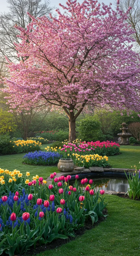 This delightful garden showcases a beautiful cherry tree in full bloom, surrounded by a stunning array of colorful tulips and daffodils. The vibrant pink blossoms of the cherry tree add a soft, romantic feel, while the tulips in shades of red, yellow, and purple bring energy and life to the space. A small pond tucked at the corner adds a tranquil element to the scene, reflecting the colors of the flowers and trees. The entire garden is perfectly designed to celebrate the arrival of spring, with the blossoms, flowers, and gentle water feature creating a peaceful and joyful atmosphere.