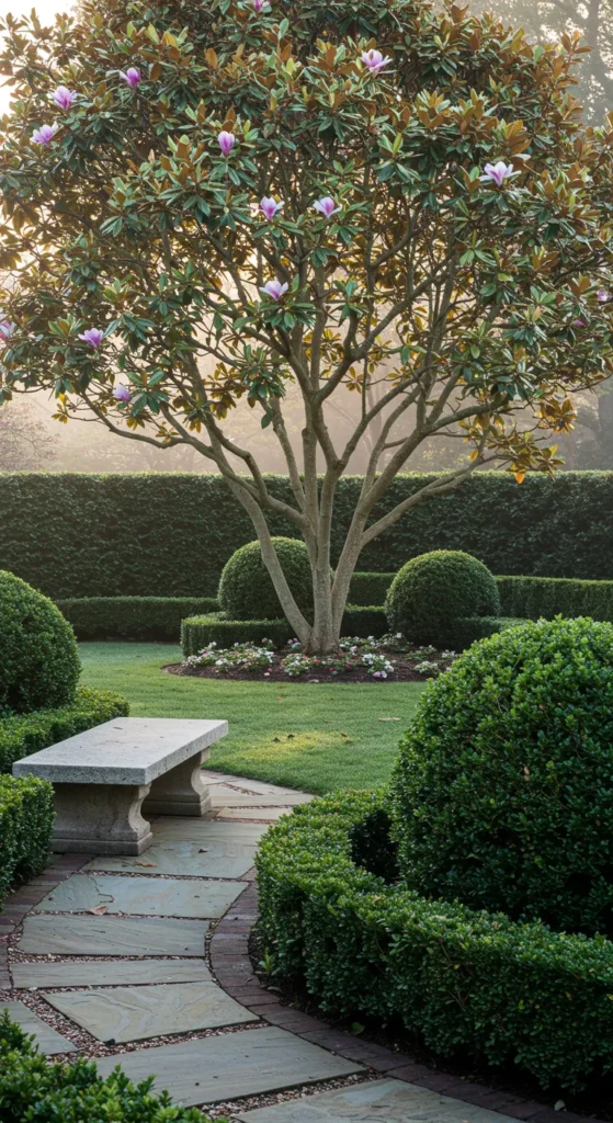 I absolutely love how this design feels like a peaceful retreat. The magnolia’s blooms add just the right amount of color without overwhelming the space, and the surrounding symmetry of the hedges gives it such a peaceful, almost meditative vibe. If you love neat, elegant spaces with a touch of nature’s beauty, this garden layout is the perfect example of how trees and landscaping can create a tranquil and visually stunning outdoor oasis.
