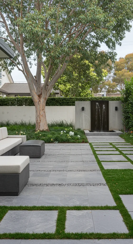This chic, modern garden combines clean lines with a natural, calming atmosphere. The centerpiece of the design is a stately eucalyptus tree, which towers over the neatly laid-out stone pathway. The gentle sound of water cascading from the elegant water feature at the back adds a peaceful touch, making this space ideal for relaxation. The minimalist seating area, designed with sleek concrete furniture, provides a perfect spot for lounging, while the surrounding greenery, including lush grass and low-maintenance plants, keeps the design feeling fresh and natural.
