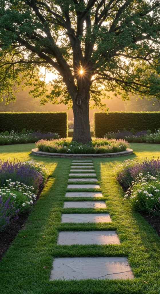 This garden design features a magnificent tree at its center, surrounded by perfectly placed stone stepping stones that lead the eye directly to the tree. The circular flower bed around the tree adds an extra touch of elegance, showcasing a blend of soft purple lavender and delicate white flowers. The neatly trimmed hedges in the background provide structure, while the lush grass complements the overall natural beauty of the space. The warm glow of sunlight filtering through the branches enhances the tranquil and peaceful atmosphere.