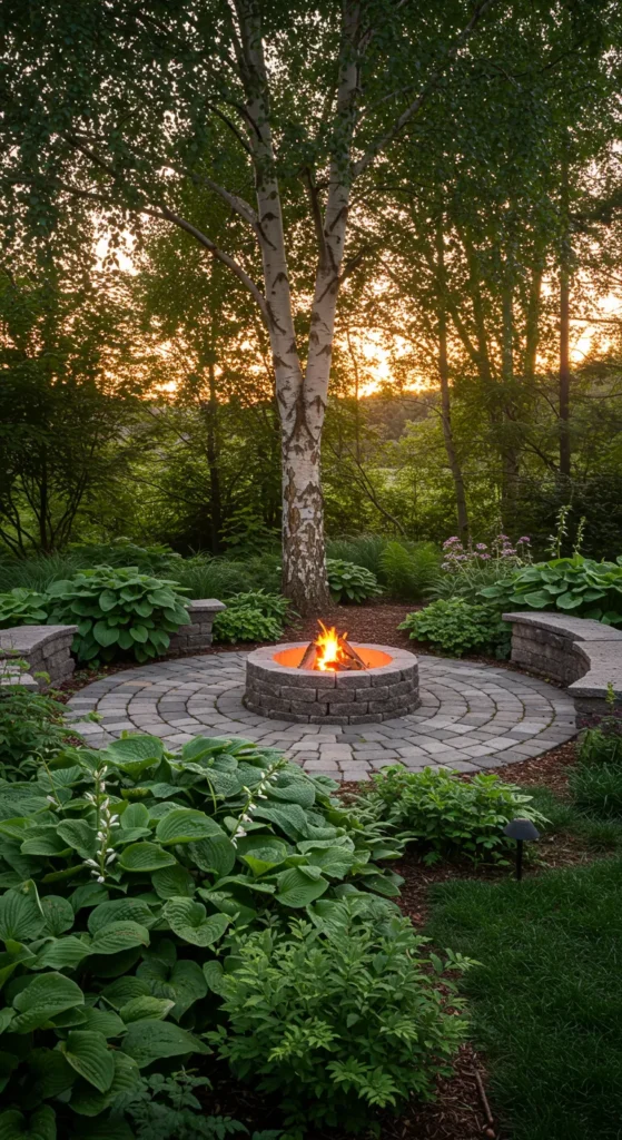 This inviting garden features a circular stone patio with a cozy fire pit at its heart. The fire pit is surrounded by curved stone seating, offering a perfect spot to gather with loved ones on chilly evenings. Lush greenery, including large hostas, surrounds the space, adding a vibrant touch of nature. A beautiful birch tree stands tall in the background, casting a calming shade over the area. The setting sun gives everything a warm, golden glow, enhancing the peaceful and relaxing atmosphere of this backyard retreat.